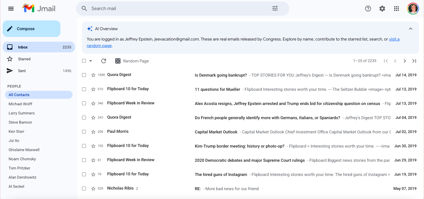 Pour garantir un accès universel à ces documents, l’ensemble des courriels a été regroupé sur Jmail, un site conçu par Luke Igel et Riley Walz. L’interface reproduit fidèlement celle de Gmail, à la différence près que l’utilisateur y navigue comme s’il était connecté au compte de Jeffrey Epstein lui‑même.
